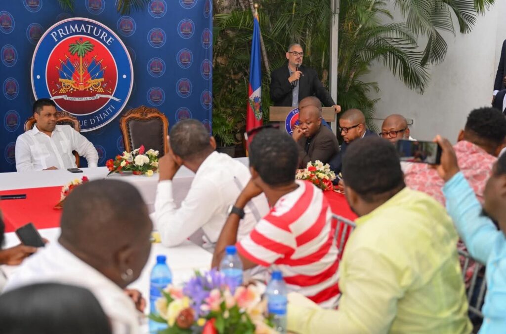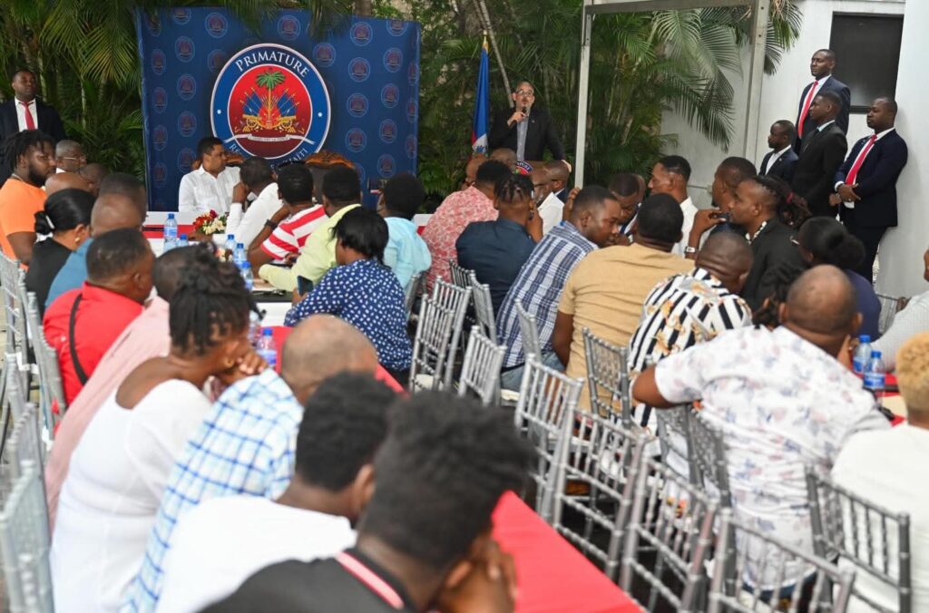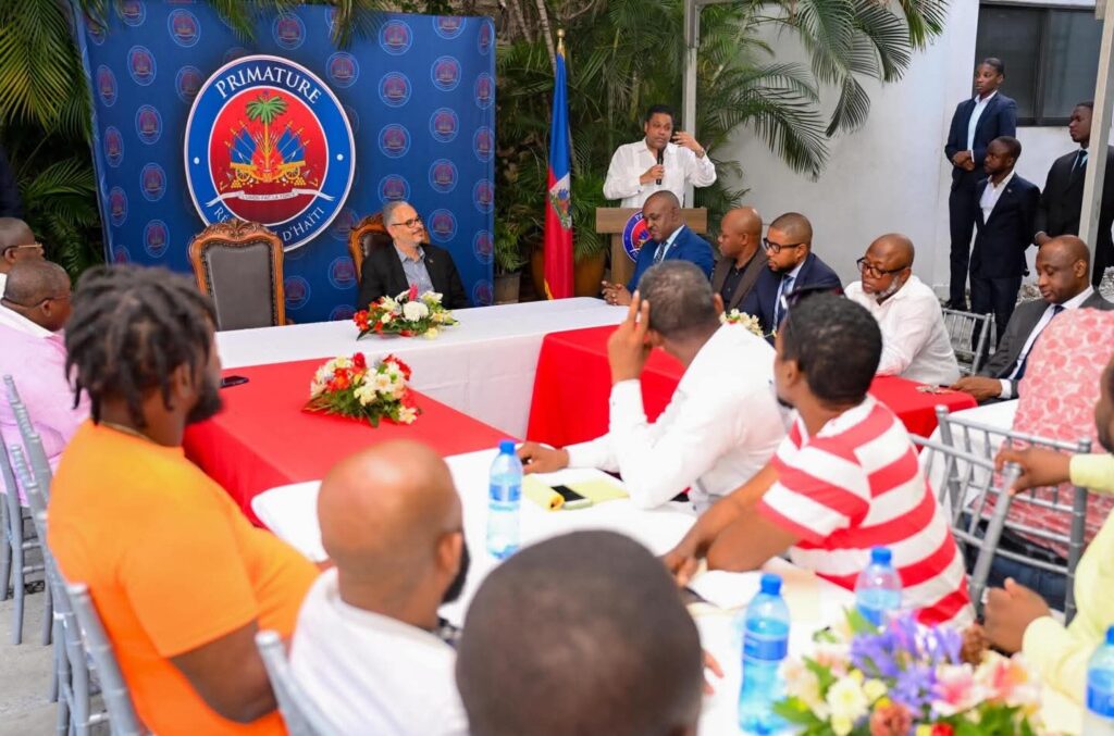 Port-au-Prince, le 23 décembre 2025. – Le Président du Conseil présidentiel de Transition (CPT), Laurent Saint-Cyr, accompagné du Premier ministre Alix Didier Fils-Aimé, a rencontré ce mardi, à la Primature, les responsables de la Commission des leaders des neuf sites de personnes déplacées internes (PDI) de la région métropolitaine de Port-au-Prince, ainsi que des membres de la Commission d’appui et de gestion des restaurants communautaires.